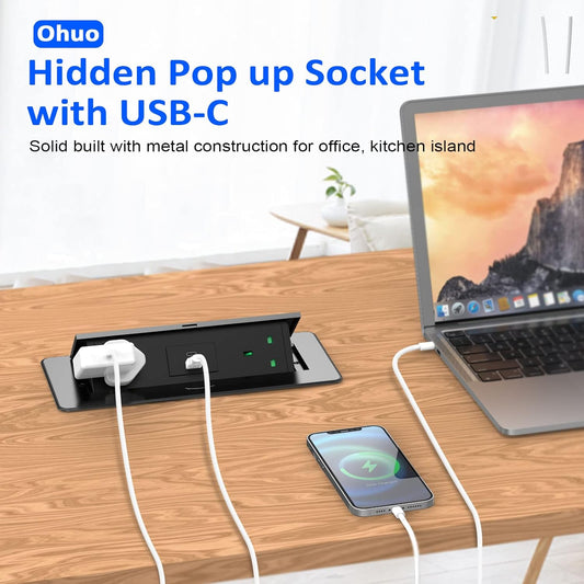 Recessed Desk Power Socket USB C, Ohuo Pop up Sockets for Worktops Hidden Desktop Power Strip with 2 USB, Aluminum