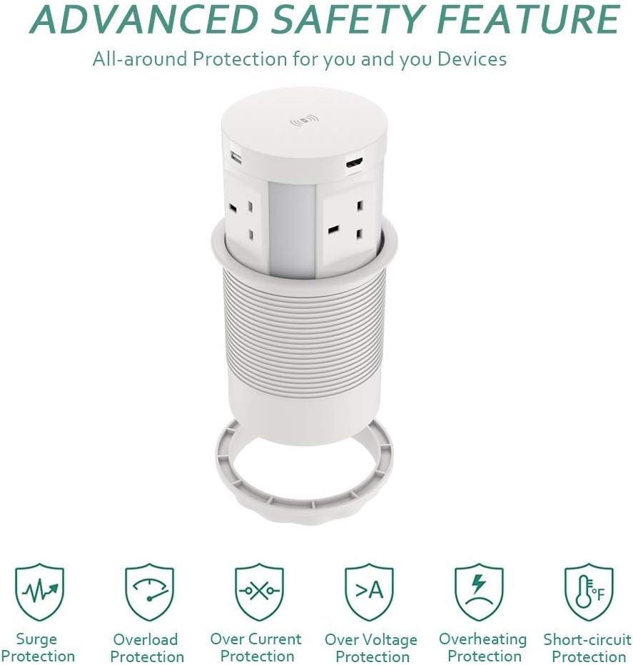 - Pop up Electrical Socket Power - Pop up socket and USB charger has surge protection, over temperature protection, over current protection. Morden design pop up outlet is able to plug-in from any direction, ideal for kitchen island, office table desktop. With 12-Month Warranty, feel free to contact us if having any question.