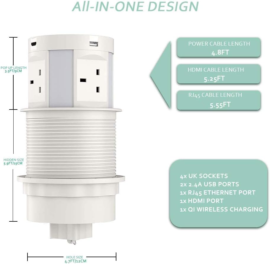 - Simple Installation - Fits a 120mm/4.7’’ hole, just cut out a 4.7’’ hole of the desk or kitchen worktop, remove the ring and slide the body from top, screw the ring tight from bottom. Simply pull up the automatic pop up power socket when it's needed. Power cable 4.80'', HDMI length: 5.25'', RJ 45 cable: 5.55''.